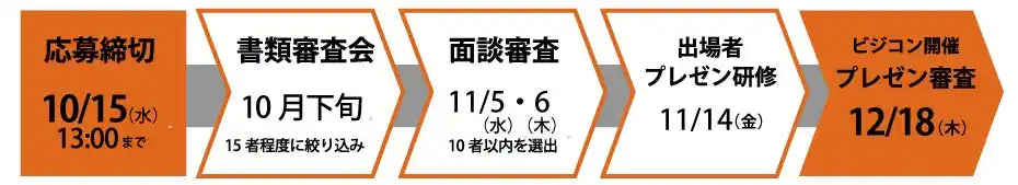 府内109の推薦機関からの推薦応募制。その中から、書類選考と面談審査を通過し、最終発表会に登壇する10者以内を選出します。 |