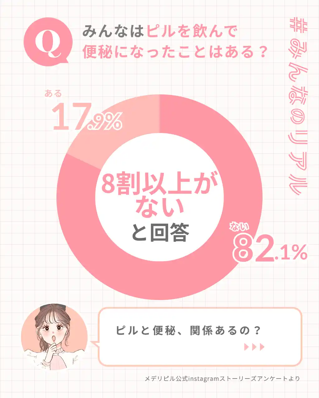 ピルに含まれる黄体ホルモンには腸のぜん動運動を抑制する作用があり、一部の方に便秘などの消化器系の副作用が起きることがあります。 しかし今回の調査では、約8割以上の方が「便秘はない」と回答し、大多数の方がピル服用による便秘を感じていないことが分かりました。一方で、体質によって便秘を感じる方もおられるため、セルフケアの選択肢を持っておくことが安心につながります。