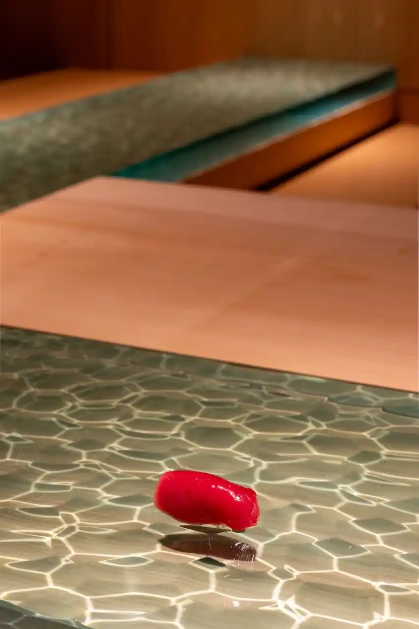 昔ながらのオーセンティックなお寿司屋さんは、檜の付け台に直接お寿司を提供していましたが、ここでは水の流れを模したガラス製の付台にお寿司を提供します。 |
