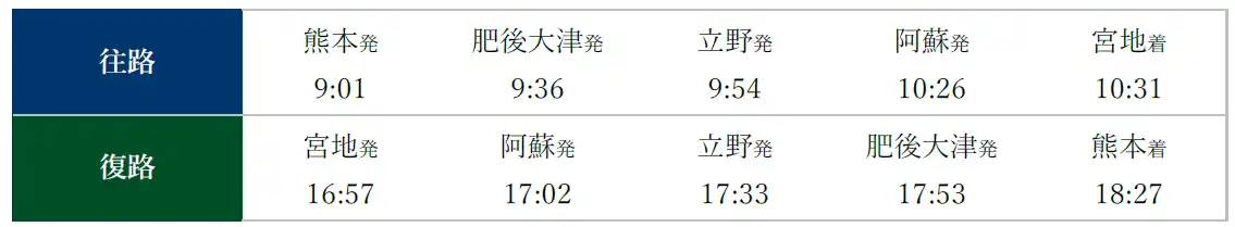 | 「熊本⇔宮地」間で1 往復運転します。秋のお出かけにぜひご利用ください。 | |||||||||