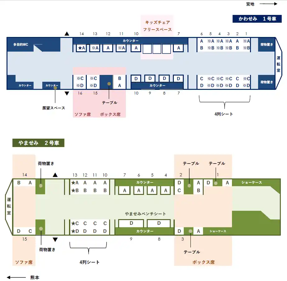 | ・※印の座席は、進行方向により、窓が小さくなる席 | |||||||||