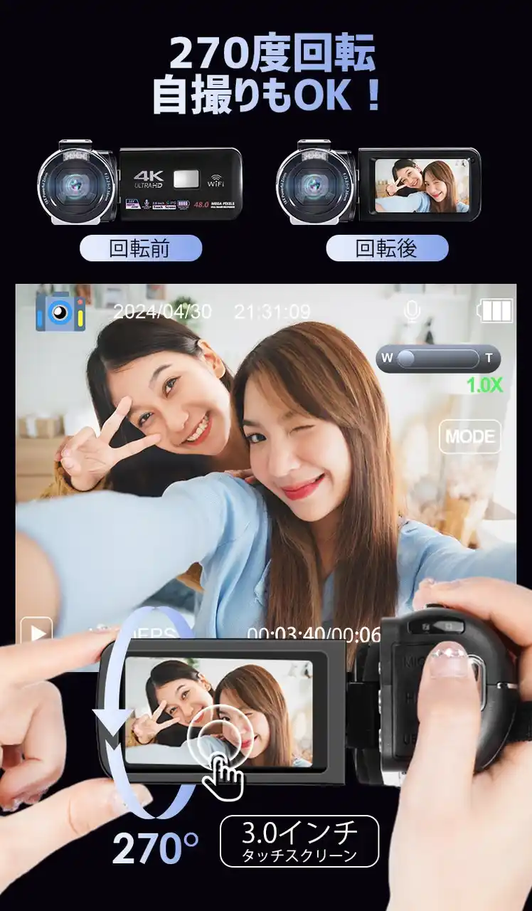 | ・ 270°回転スクリーンで、ハイアングル・ローアングル・自撮りに対応 | |||||||||||||||||||