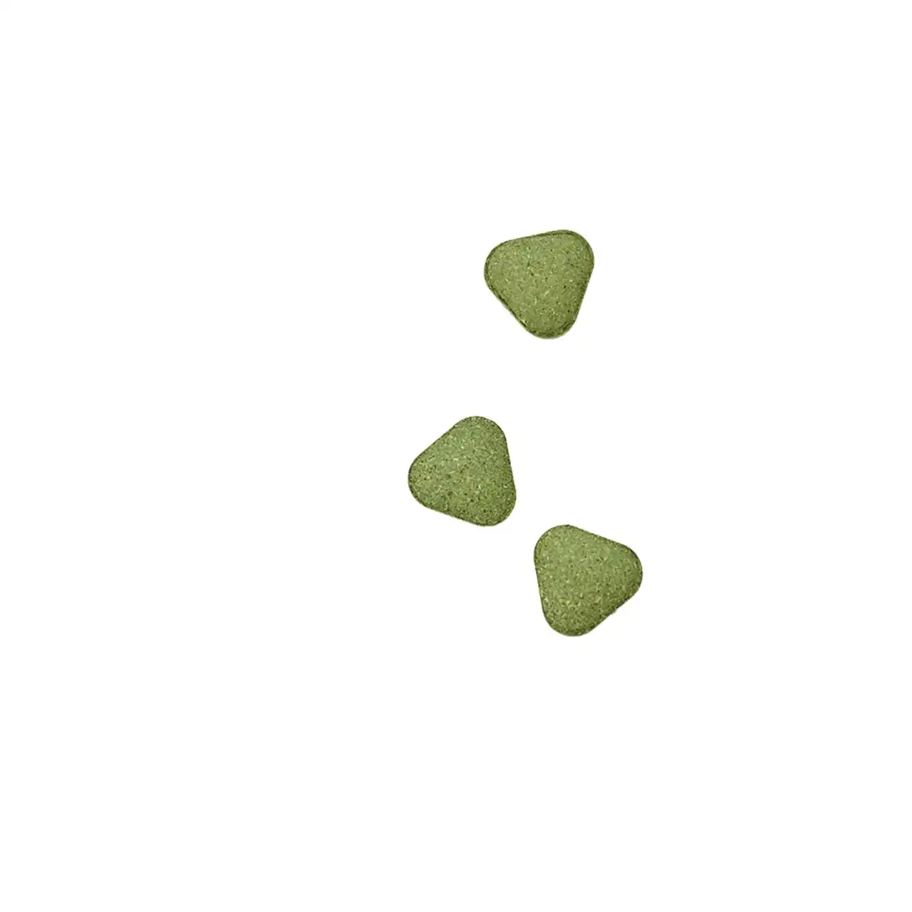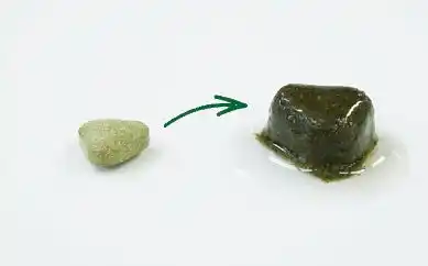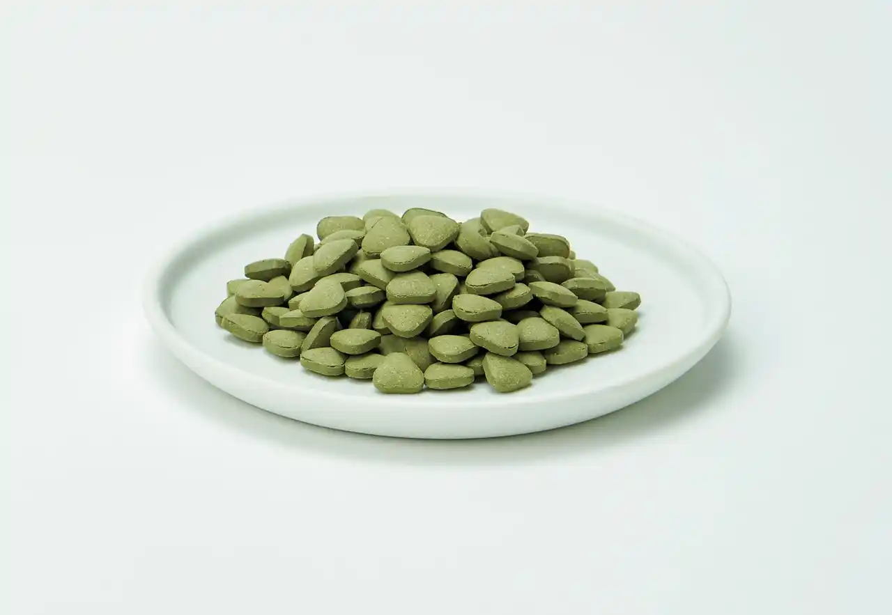「あおつぶ」はモロヘイヤ100%の野菜粒です。原材料はモロヘイヤのみで、1粒に約2.5枚のモロヘイヤの葉が含まれています。 |
