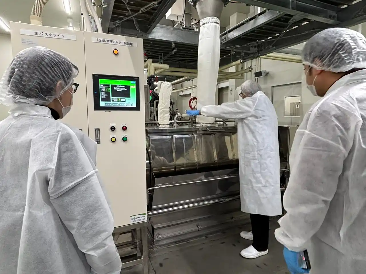 食品工場のため、見学者は現重装備でエアシャワー室を通ってから入場します。 |