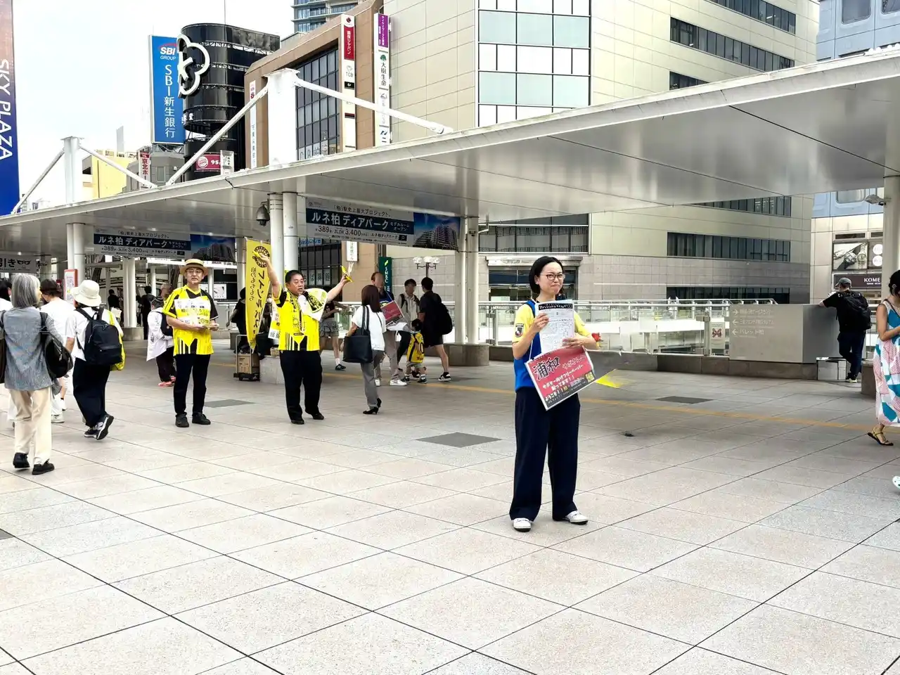 柏レイソルのホーム試合前にJR柏駅前ダブルデッキでフリーペーパー「柏でよりみちアディショナルタイムズ」と一緒に「柏のもちもち レイソルパスタ」のフライヤーを配布しました。 |