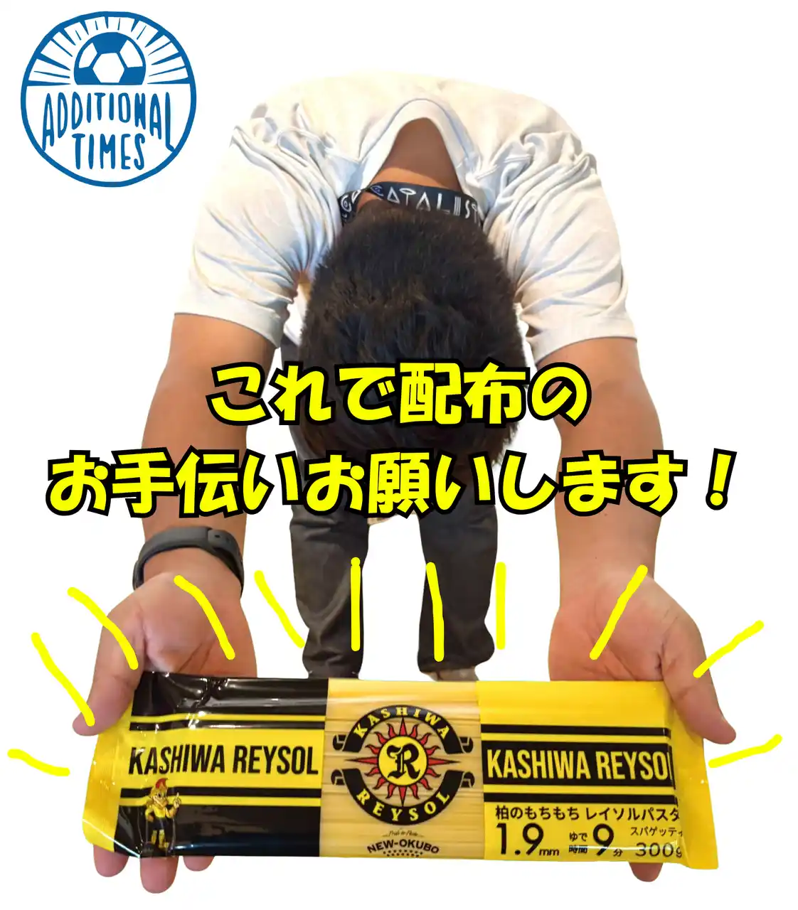 また、AT社は、柏レイソルのリーグ戦ホームゲーム開催時にホーム、ビジター双方のサポーターに向けて、フリーペーパー「柏でよりみちアディショナルタイムズ」と一緒に柏駅前でニューオークボの「柏のもちもち レイソルパスタ」のフライヤーを配布。サポーターの皆様には試合の前後に、柏のお土産として購入していただけるように促しています。 |
