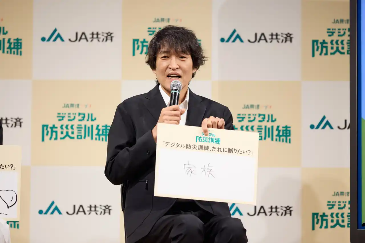 続いて、千原ジュニアさんも同じく「家族」と回答。お二人とも同じ回答になった点について、「やっぱりそうなりますよね!あとは、友達全員!(笑)」と、ゆうちゃみさんと同様に、一番大切な家族に防災訓練を贈りたいとコメントしました。 |