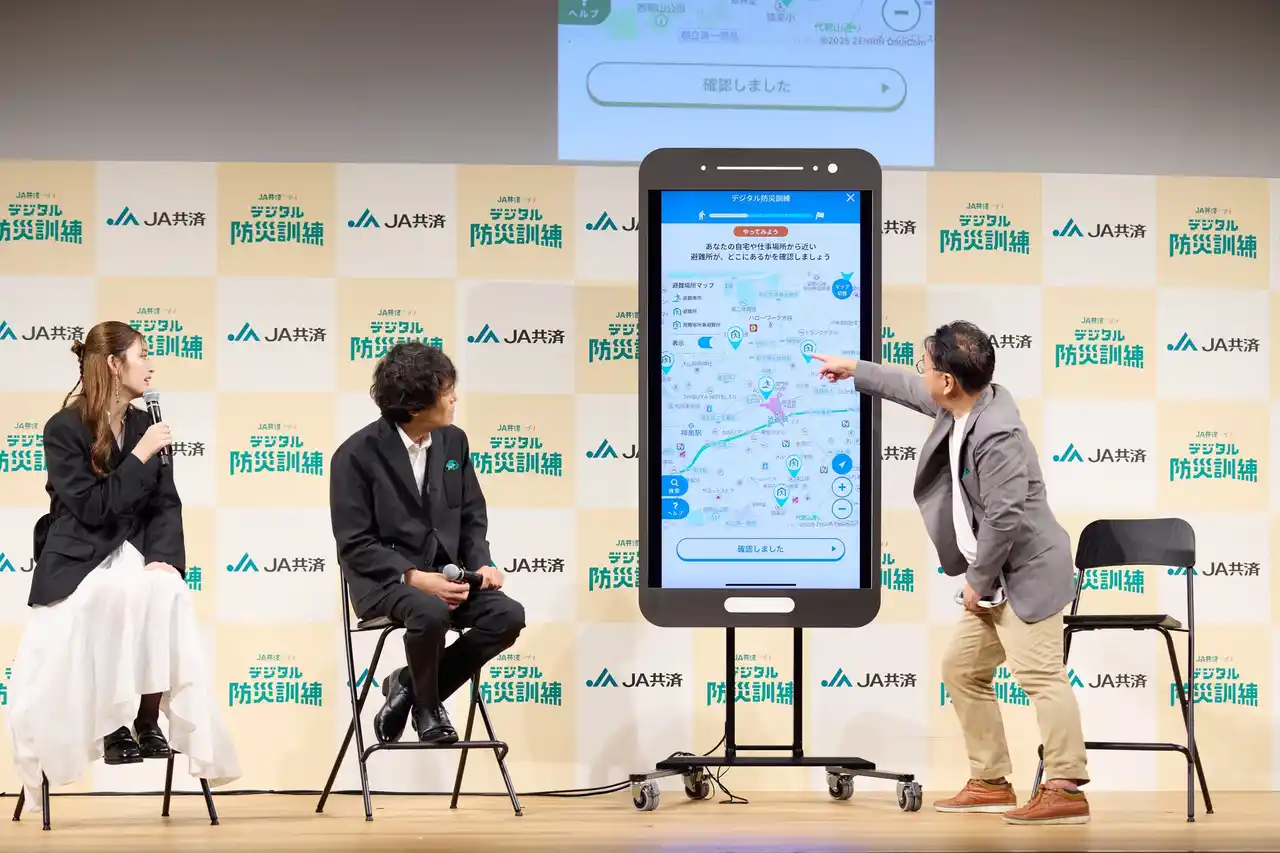 続いて、千原ジュニアさん、ゆうちゃみさん、災害リスク評価研究所の代表 松島康生さんが登壇し、実際にデジタル防災訓練のデモンストレーションを行いました。 |