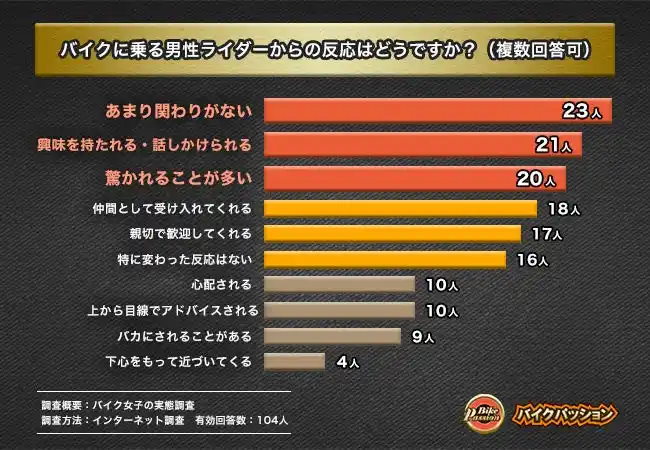 男性ライダーからの反応『あまり関わりがない』が23人で最多の回答に!続いて『興味を持たれる・話しかけられる』 |