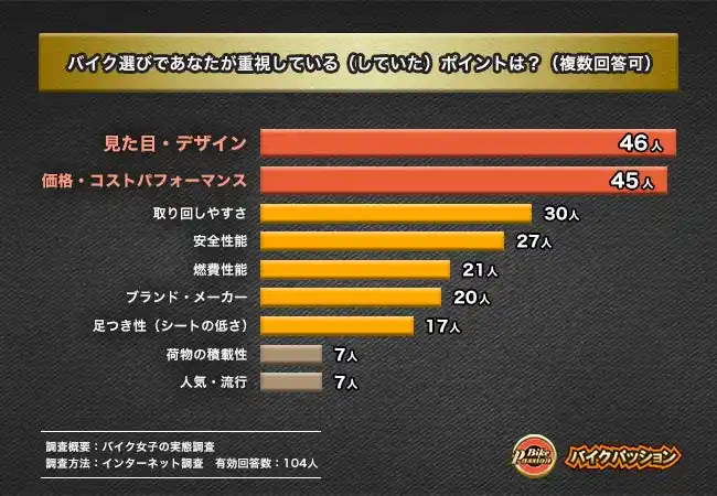 女性がバイク選びで重視するポイント『見た目・デザイン』が最多の回答に!『価格・コストパフォーマンス』が続く |