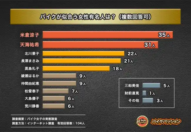 次に「バイクが似合う女性有名人は?」と質問したところ、米倉涼子さん(35人)が1位となりました。続いて天海祐希さん(31人)、北川景子さん(22人)、長澤まさみさん(21人)の順となっています。 |