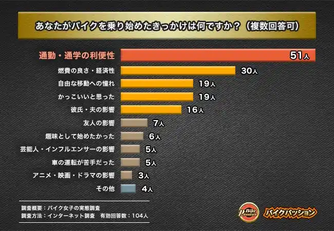 次に「あなたがバイクを乗り始めたきっかけは何ですか?」と質問したところ、『通勤・通学の利便性』(51人)が最多となりました。約2人に1人と多くの女性が、実用的な理由でバイクを選んでいることが明らかになりました。 |