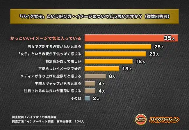 「バイク女子」に対するイメージ、『かっこいいイメージで気に入っている』が35人で最多に!一方で『男女で区別する必要がない』という声も |