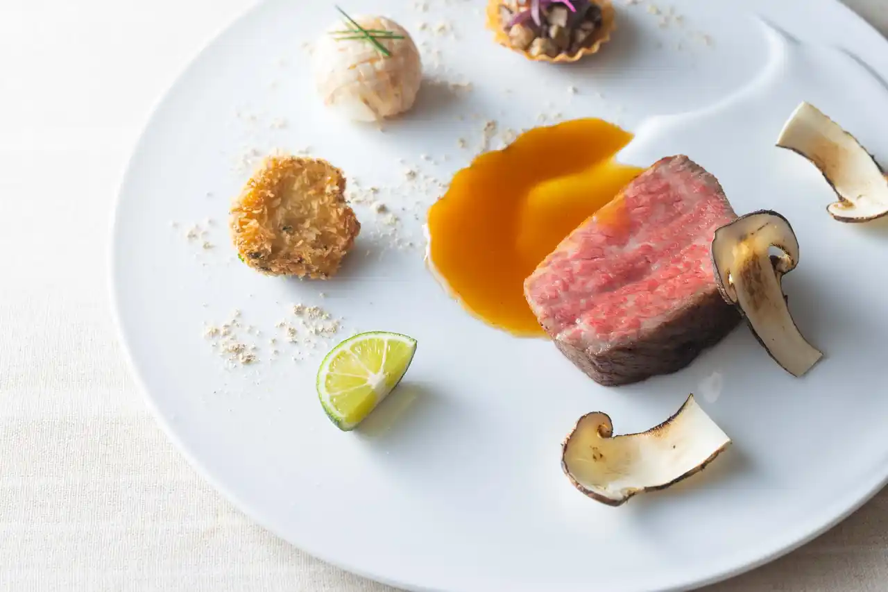 メインディッシュには、黒毛和牛のローストを贅沢に。噛むほどに柔らかい肉質と上品な味わいが口の中に広がります。一緒にお届けするプレートには、秋の味覚・松茸を3つのスタイルで。香りと食感を味わえるタルト、“松茸ご飯”は一口サイズで、そして松茸本来の味わいを楽しめるフリットによって秋を感じる一皿の完成です。デザートは、瑞々しいシャインマスカットを主役に仕立てた「不思議の国のパフェ」。グラスの足元にはフレッシュのシャインマスカットをしきつめ、シャーベットやクリーム、ジュレが層をなすパフェは爽やかな甘さと上品な酸味のバランスをお楽しみください。口に運ぶたびにシャインマスカットの清涼感と贅沢な香りが広がり、秋のコースを締めくくるにふさわしい華やかなデザートです。 |
