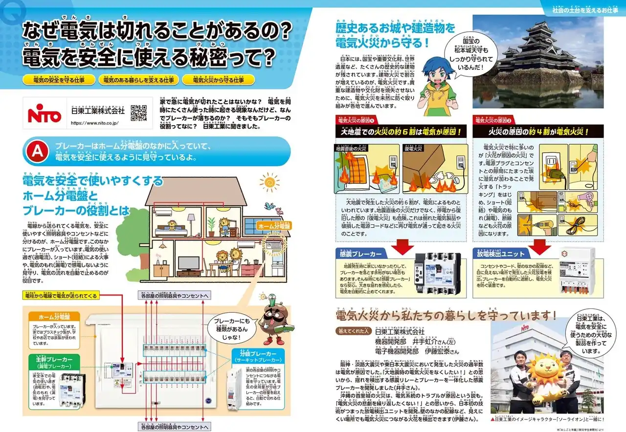 日東工業は、電気のある暮らしを支える仕事として、「なぜ電気は切れることがあるの?」「電気を安全に使える秘密って?」というテーマについて親しみやすいイラストでわかりやすく紹介しています。 |