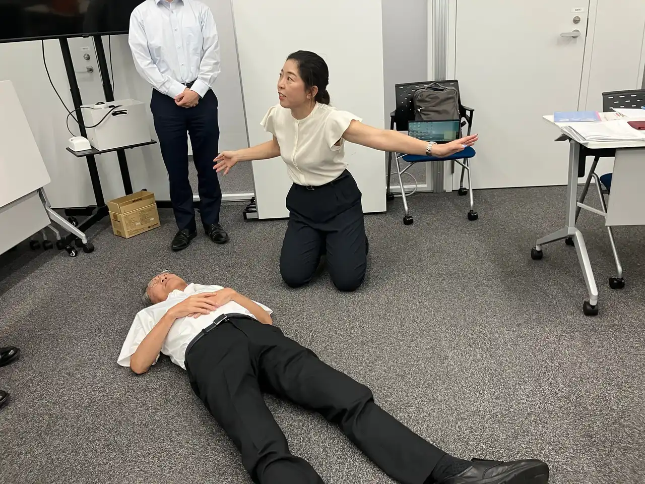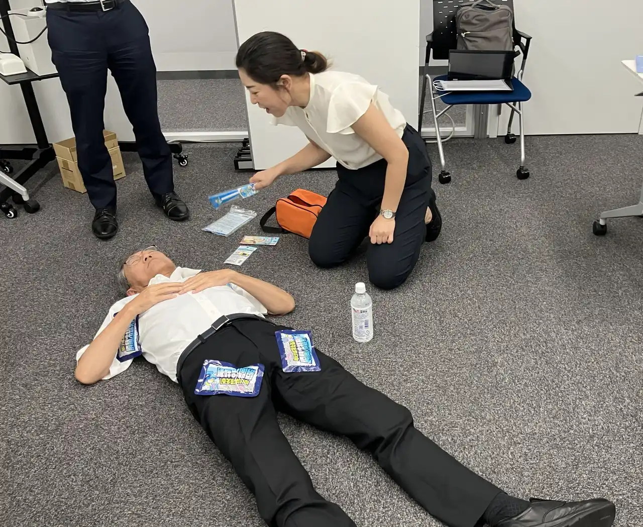 当社初の試みとして、東京本社・中部支店において、さんぎょうい株式会社様を講師に迎え、熱中症発症時の救急措置訓練を実施しました。講義とシミュレーションを通じて、社員一人ひとりが緊急時における適切な対応を習得し、安全意識の向上を図ることを目的としています。 |