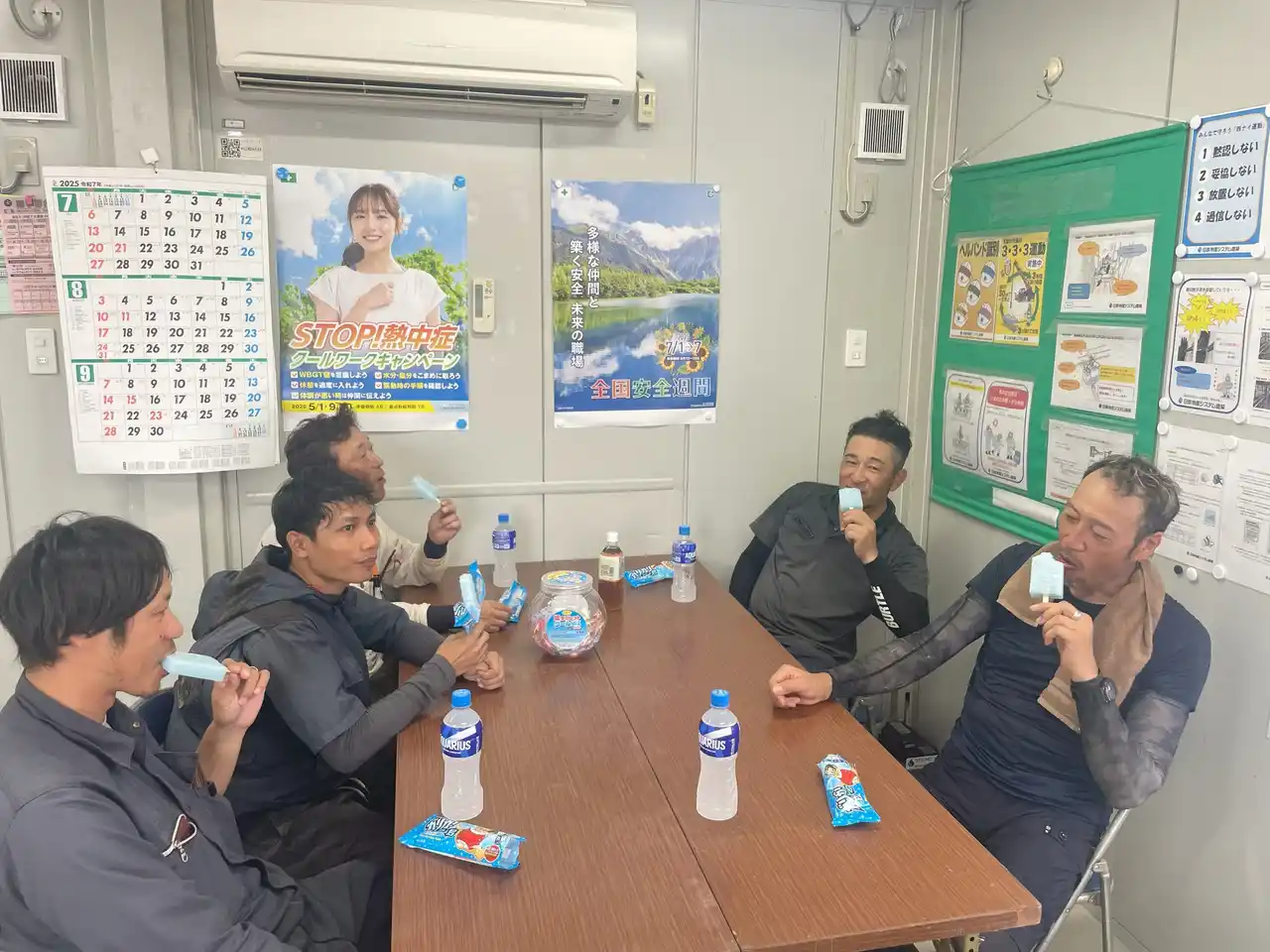 現場には、塩分入りの菓子やタブレット、スポーツドリンク、冷却グッズなどを常備し、作業員同士がリラックスしながら体調を整えることができる環境づくりを進めています。また、気温や湿度の高い日は「ちるちるハッピータイム」の回数や時間を柔軟に調整するなど、現場の実情に合わせた運用を実施中です。 |
