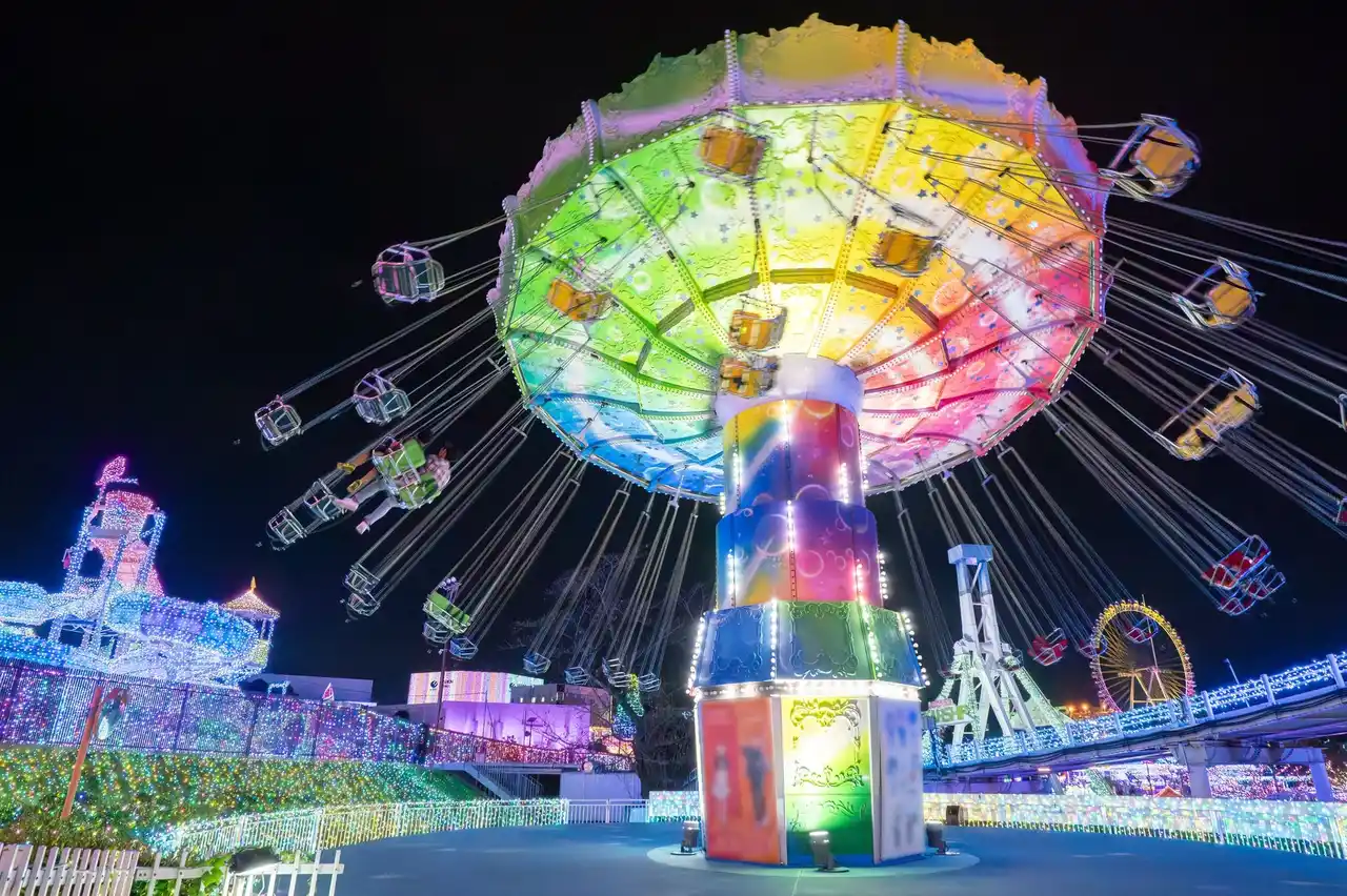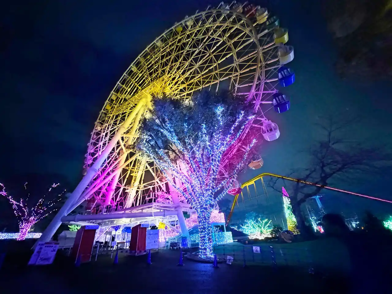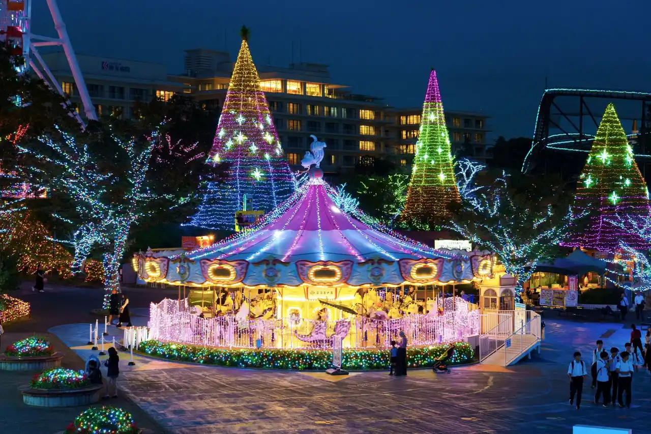 アトラクションに乗りながら眺めるイルミネーションは遊園地ならでは。観覧車やジェットコースターなどのアトラクションからは都心のパノラマ夜景もご覧いただけます。 |