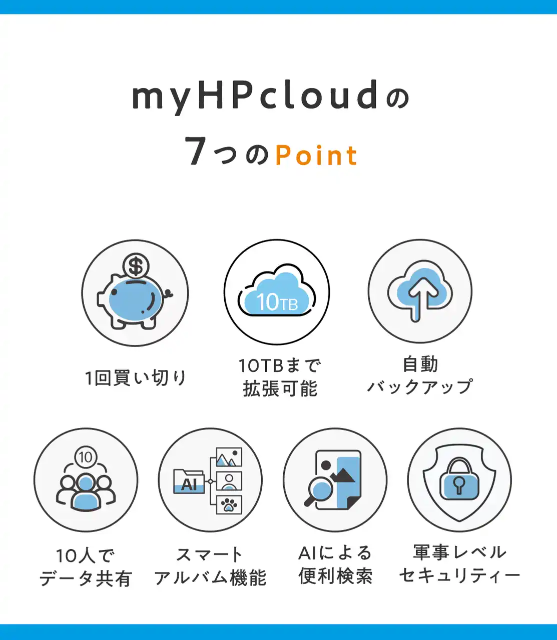 myHPcloudは、世界中のどこにいても、写真や仕事で利用するデータに簡単にアクセス・共有できる最先端技術を搭載したクラウドストレージサービスです。 |