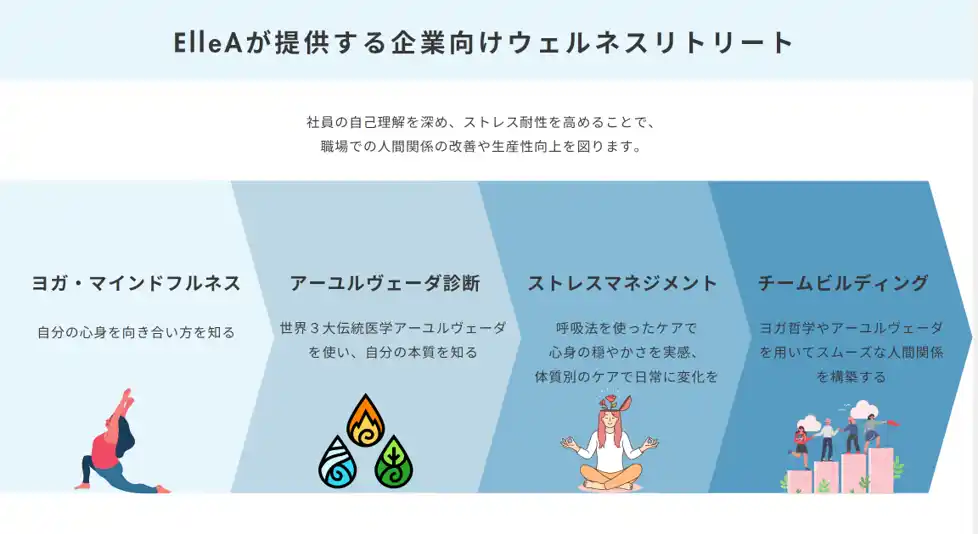 1. 訪日外国人向けウェルネス体験のノウハウを活用:多文化・多様な価値観に対応してきた経験を、国内企業の人材育成に応用 2. オンサイトで実施可能:社員の移動負担を最小化 3. カスタマイズ性:業種や企業課題に合わせたプログラム設計 4. 体験重視:その場で実践し、翌日から活かせるスキル習得 |