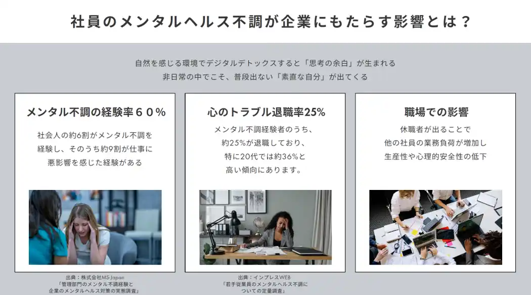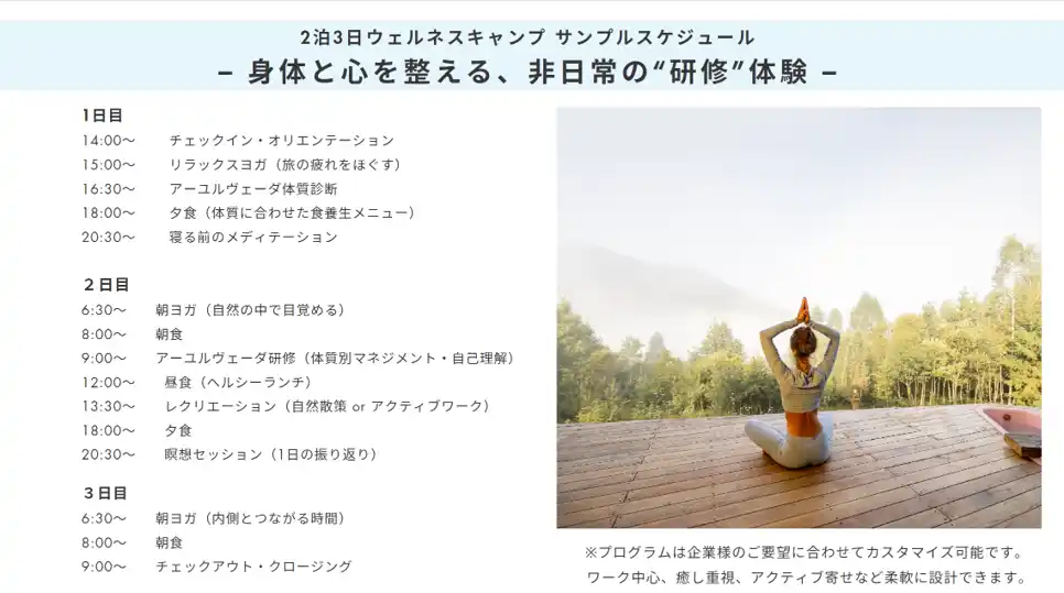 近年、企業においてはメンタルヘルス対策や社員エンゲージメントの強化が重要な経営課題となっています。一方で、従来型の研修は「座学中心」で実践につながりにくいという課題がありました。 HOPPERSはこれまで、訪日外国人向けにフィットネス・マインドフルネス・食・温泉・ヨガといったウェルネス体験を提供し、多様な文化背景を持つ顧客に高い満足度を実現してきました。 その知見を企業研修向けに最適化したものが、ウェルネスリトリート研修「Wellness Camp」です。 |