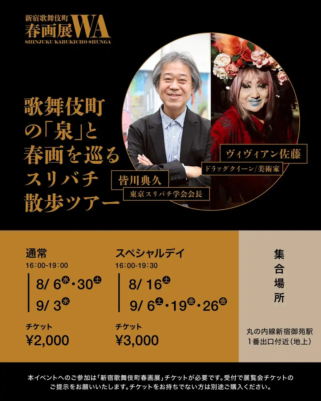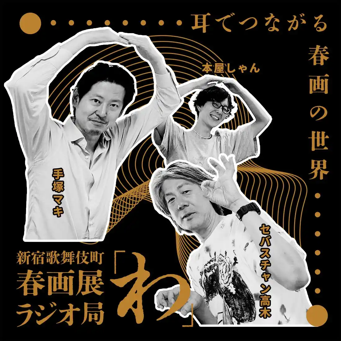 | ナビゲーターは手塚マキ(Smappa!Group代表/本展企画者)とセバスチャン高木(日本文化ラジオナビゲーター)。アシスタントに本屋しゃん(本展プロジェクトマネージャー)を迎え、歌舞伎町から文化の魅力を発信します。 | |||||||||||||||||||||||||||||
