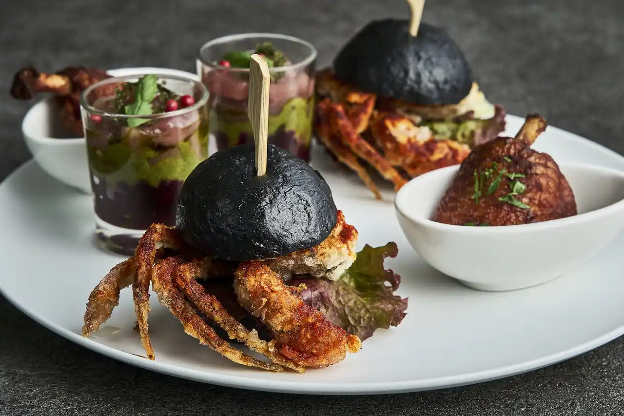 ハロウィンの世界観をセイヴォリーで表現した、遊び心あふれる3品をご用意しました。まず目を引くのは、真っ黒な自家製竹炭バンズがインパクト抜群の「ソフトシェルクラブバーガー」。サクサクに揚げたソフトシェルクラブに、スウィートチリマヨネーズとサニーレタスを合わせ、見た目も味も大胆に仕上げました。カツオに爽やかなジェノベーゼソースを合わせ、ビーツと海ブドウの食感がアクセントとなる「鰹とビーツのタルタル」や、スパイスの香りが食欲をそそる「スパイシーチキン」は、ハロウィンの熱気を感じさせるような力強い味わいです。 |
