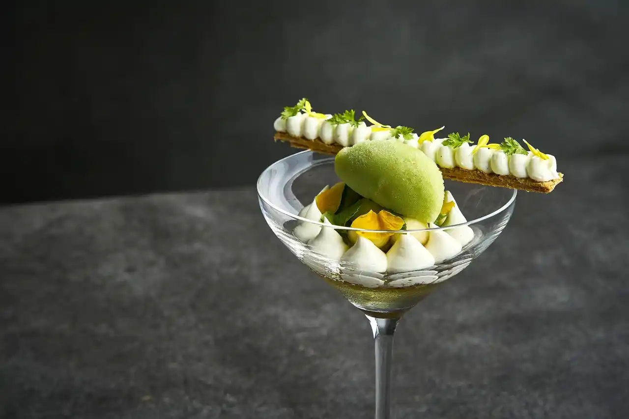 厳しい残暑を爽やかに乗り切っていただきたい、そんなシェフの想いから生まれた、夏の終わりにぴったりのカクテルスイーツです。青りんごのゼリーをベースに、香ばしいクランブル、りんごのクリーム、マリネしたきゅうりと青りんごを重ね、仕上げにりんごときゅうりのソルベを添えました。みずみずしい果実と野菜の組み合わせが、口の中に清涼感を広げ、残暑の疲れをそっと癒してくれる味わいです。 |