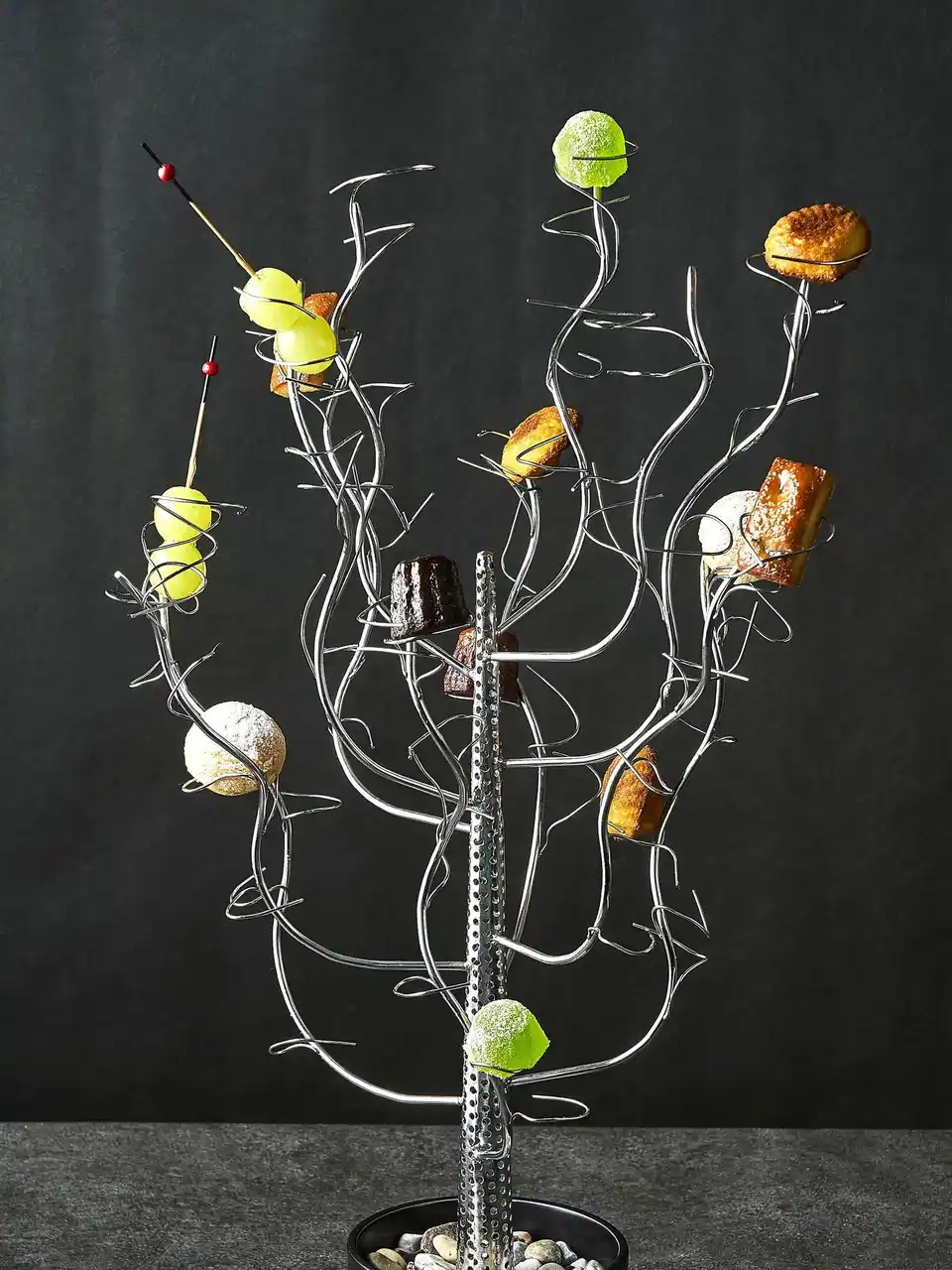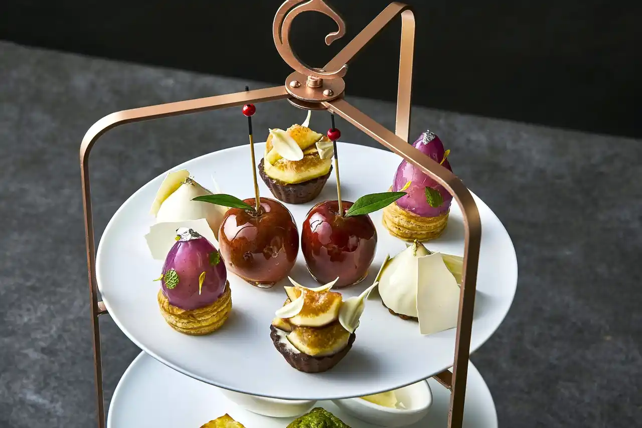 ユニークなツリー型スタンドでご提供するのは、ジューシーなマスカットが口いっぱいに広がる「ぶどう飴」や、濃厚な甘さが魅力の「栗のシュークリーム」、紅茶と相性抜群の「カヌレ」や「ミニマドレーヌ」です。くだもの狩り気分を楽しみながら、センタラグランドホテル大阪でしか体験できないティータイムをお過ごしいただけます。 |