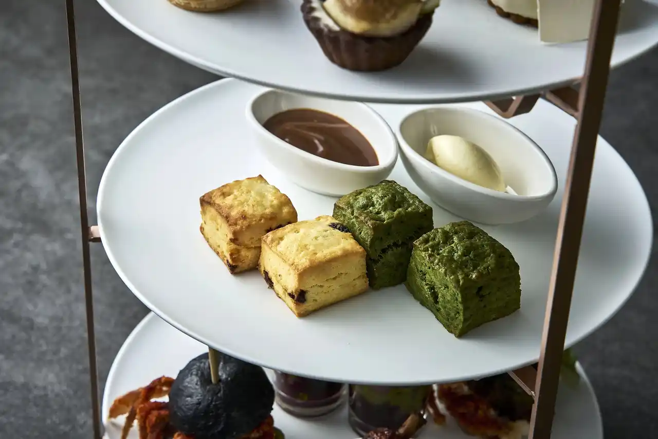 四角いフォルムが愛らしい、2種類のスコーンをご用意しました。ふんわりとした口当たりのレーズン入りスコーンと、香り高い抹茶味のスコーン。どちらもキャラメルジャムと濃厚なクロテッドクリームを添えてお届けします。見た目の可愛らしさと、素材の風味を引き立てる組み合わせが、ティータイムをより豊かに彩ります。 |