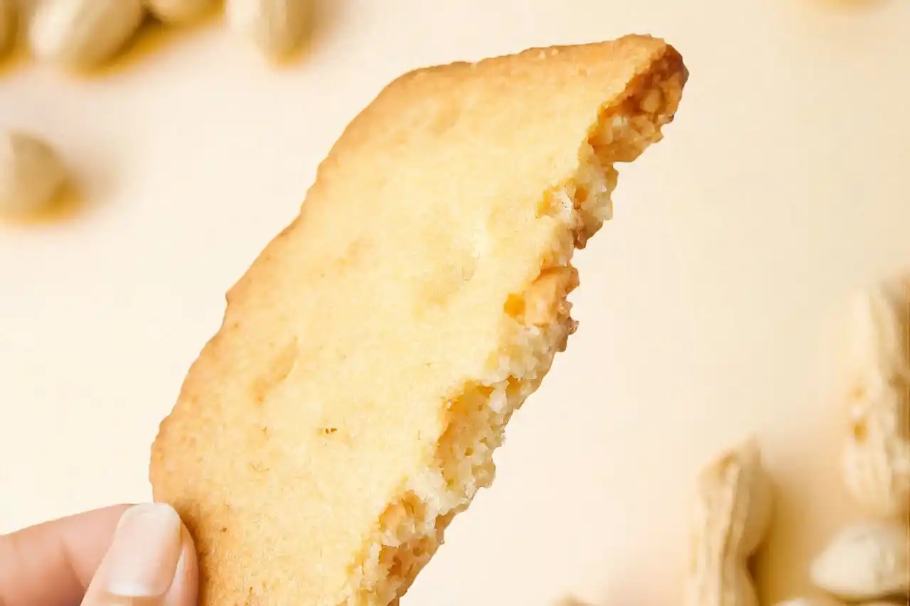 落花生の旨みを引き立てるために、生地はほどよい甘さに仕上げました。 ザクザクの生地は、落花生の粒ごとの歯ごたえとのコントラストも楽しめる、絶妙なバランスです。 |