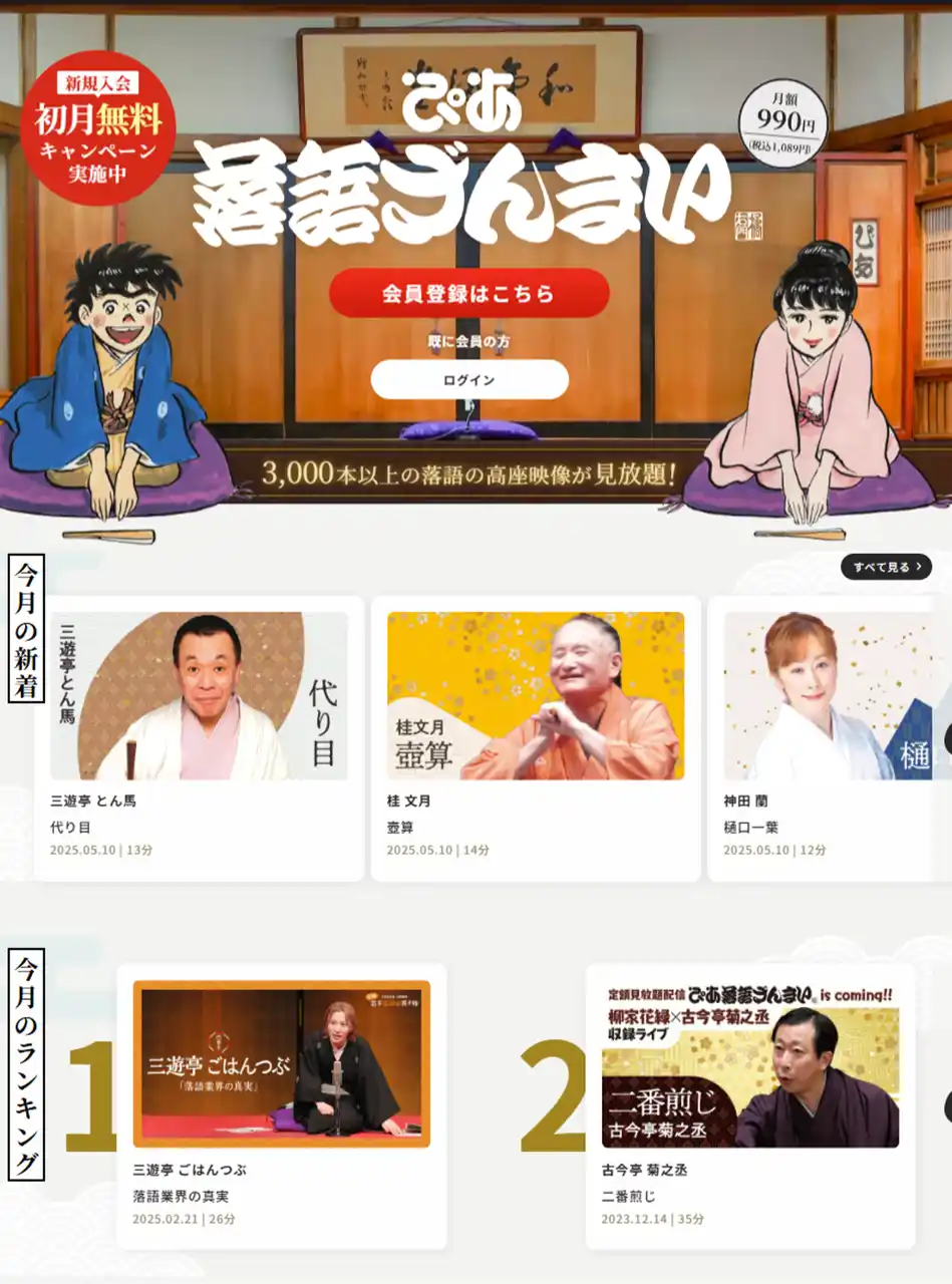 | また、ただいま新規入会の初月無料キャンペーンを実施中。新規入会日(有料会員登録)から1ヶ月間は無料で高座映像の見放題サービスをお楽しみいただくことが出来ます。 | |||