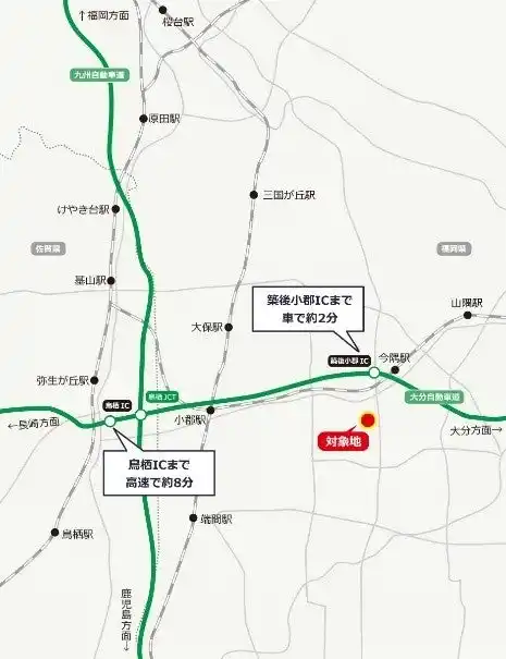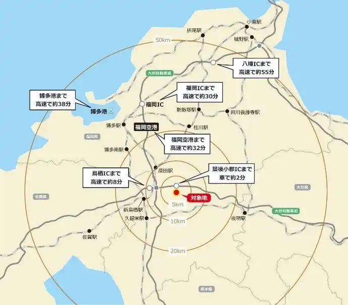 本施設は、九州自動車道「筑後小郡IC」から約1.3km(車で約2分)に位置し、鳥栖JCTや福岡空港、博多港へのアクセスにも優れ、九州全域をカバーできる物流拠点です。最寄り駅から徒歩圏内であることに加え、人口約30万人を擁する久留米市にも隣接しており、通勤利便性が高く、安定した人材確保が見込めます。 |