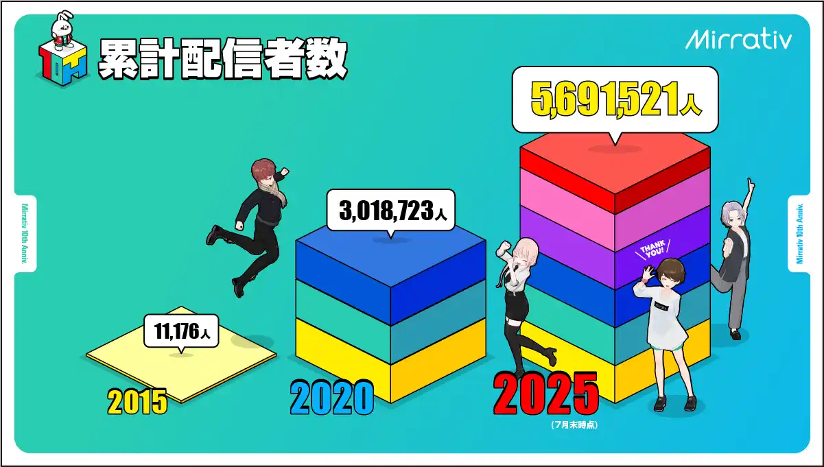 Mirrativで配信を行ったことがある配信者数です。2015年には11,176人だった配信者は、2025年7月末時点で、約569万人を数え、現在も増加中。日本最大規模の「初配信」を作り出したプラットフォームとなっています。 |