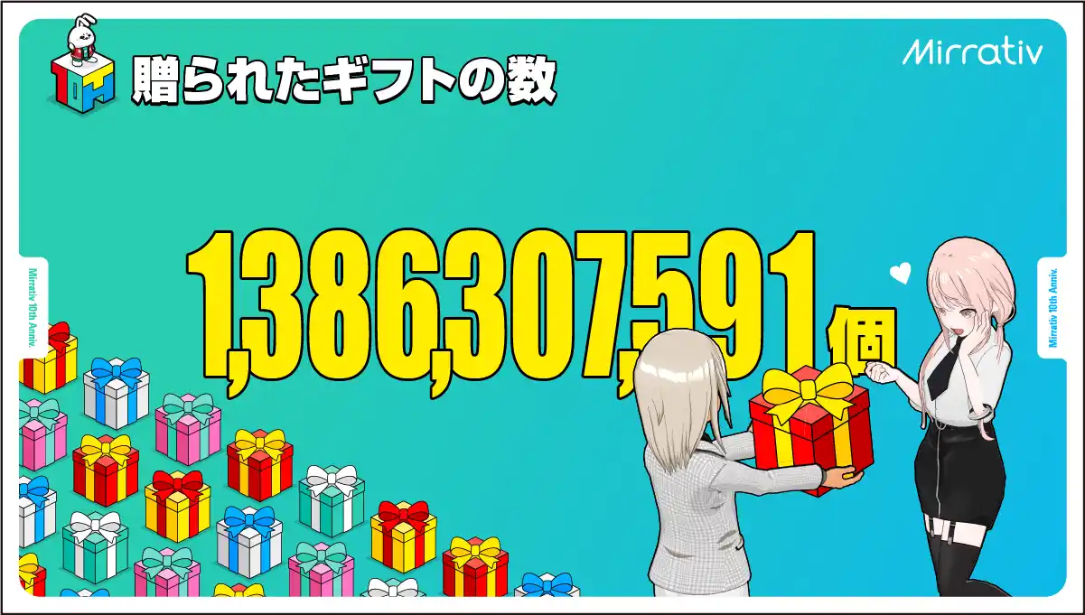 2018年、Mirativにギフト機能導入後に、贈られたギフトの数です。13億8,630万個ものギフトが配信者さんに贈られ、配信者さんと視聴者さんとの絆を作ってきました。 |