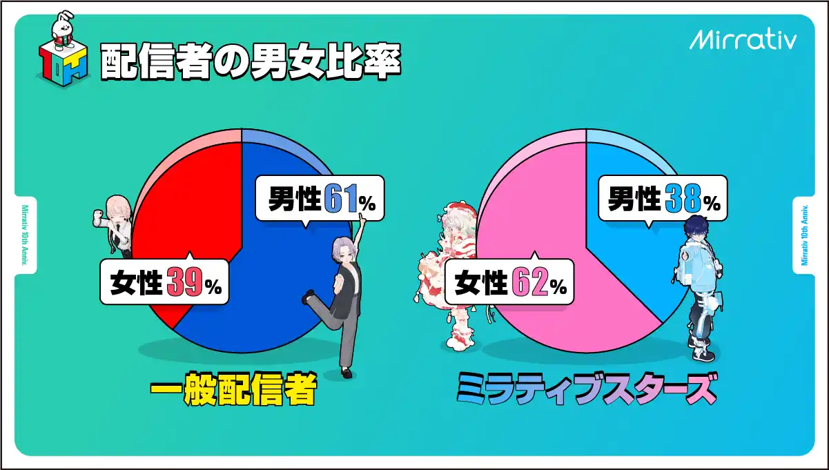 2025年8月時点のMirrativの配信者さんの男女比率です。一般的な配信者さんにおいては男性がやや多く、ミラティブスターズにおいては女性がやや多くなっています。 |