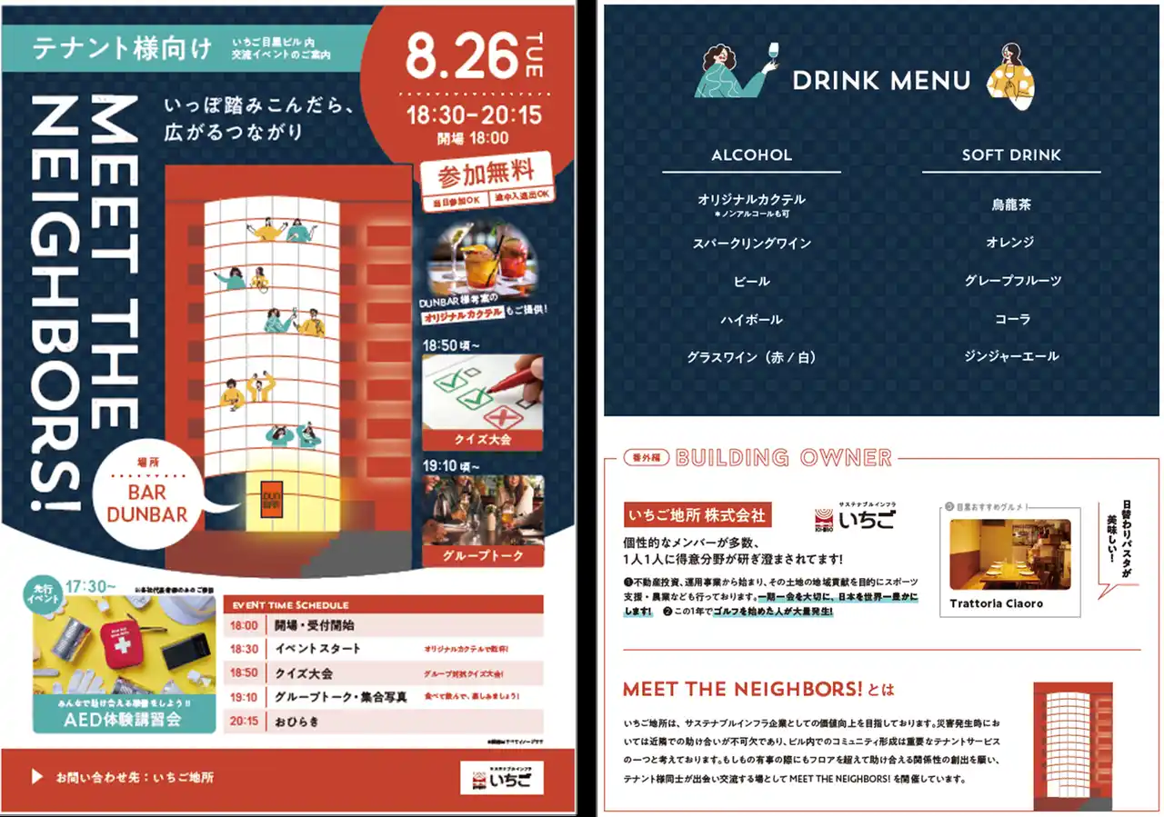 心を込めて現存不動産に新しい価値を創造する、心築(しんちく)を軸とした事業モデルを展開しています。いちごが保有するオフィスビル「いちご目黒ビル」にて、テナント様や近隣の皆さまをつなぐ「お隣り同士の交流会」として、Meet The Neighbors!というイベントを2025年8月26日に開催しました。 |