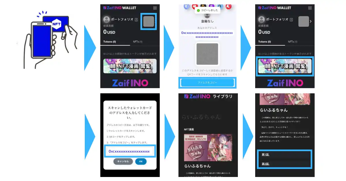 『らいふるちゃん』NFT購入時に受け取った NFTカードをスマートフォンでスキャンし、Zaif INOウォレットへアクセス |