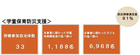3年間の事業期間を通して、佐賀県、熊本県において、学童保育支援員向けに防災研修を計14回実施しました。2024年には学童保育に常備する非常用持ち出し袋や、大型救急箱などの備品も一部支援しました。 |