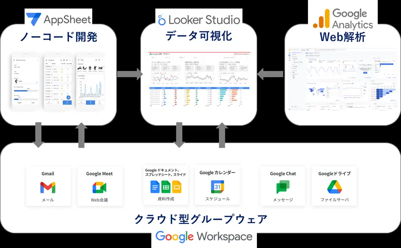 「Google Workspace」を中小企業の業務フローに取り入れることで、データの管理から分析、活用まで一元化が可能に。導入から運用までスムーズに行えて、業務効率が格段に改善されることが期待できます。
