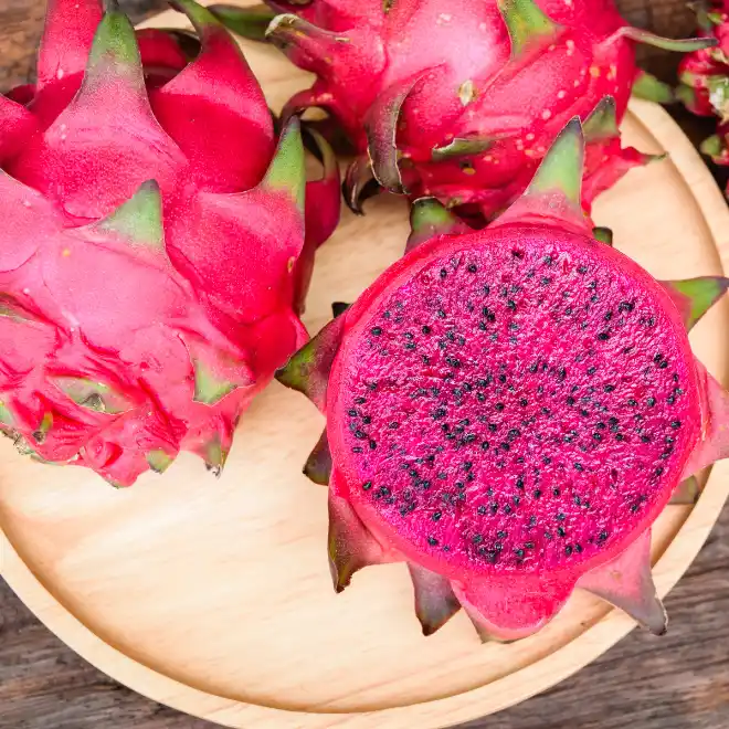 | ドラゴンフルーツの味は、白・赤どちらも水分が多く爽やかな甘さになっています。「ホワイトドラゴンフルーツ」は皮が赤いものの、果肉は白く、さっぱりとした甘さの中に少し酸味があり、キウイフルーツに似た食感があります。一方、今回お届けする「レッドドラゴンフルーツ」は皮が赤く、果肉も鮮やかな赤色をしています。味は白よりも甘く、ベリーのような風味があります。 | ||||||||||||||||||