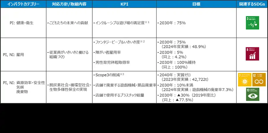 当社は「こどもたちの夢中を育み、”えがお”あふれる世界をつくる。」をパーパス(社会的存在意義)に掲げ、2022年4月には「サステナビリティ方針」を制定しており、持続可能な社会への貢献と企業価値向上を実現する企業を目指しています。本ローンの実行あたっては、当社のサステナビリティ・ビジョンならびに重要課題(マテリアリティ)を中心に、事業活動に伴う社会的責任や、SDGs 達成に向けた貢献について、あおぞら銀行による分析・評価に基づき、後記のKPI を設定しました。 |