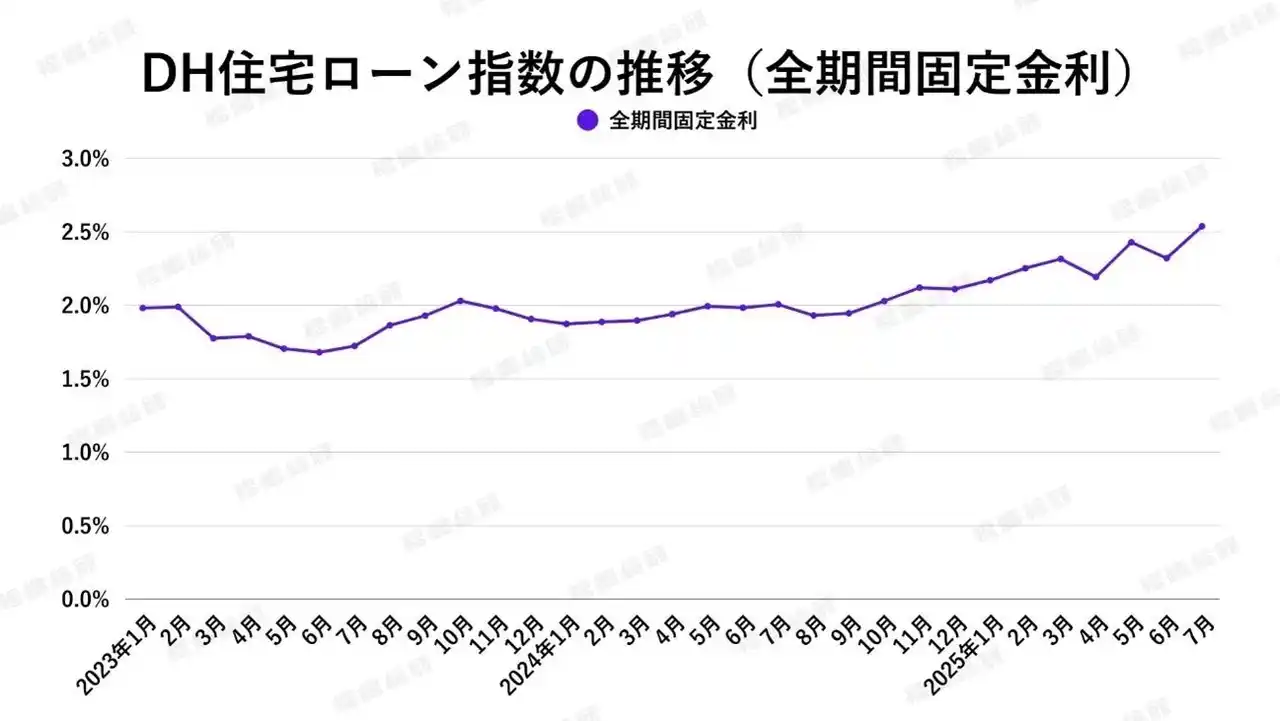 | ただし、DH住宅ローン指数の全期間固定は2.538%と、前月(2.321%)より下落しました。これは一時的に国内金利が下がった影響ですが、1年前(2.006%)と比べれば依然として上昇トレンドにあります。 | ||||||||||||||