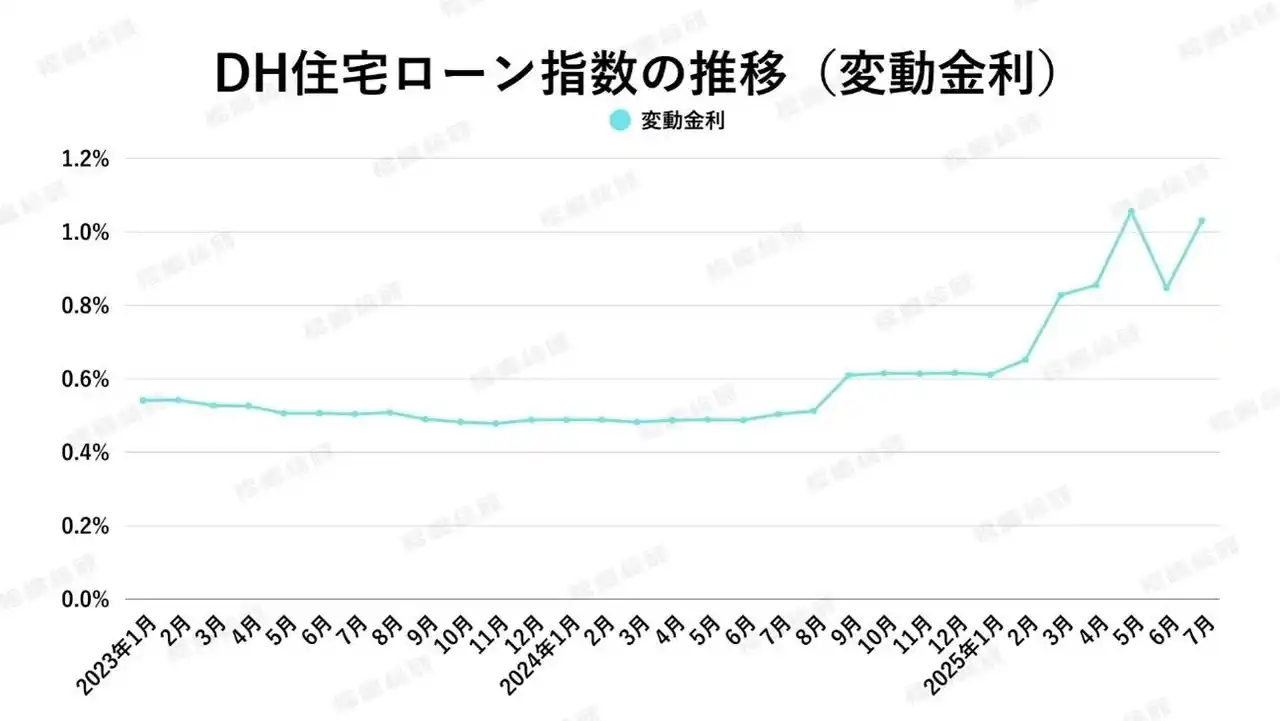 2025年7月は、短期金利に大きな変化はなく、多くの銀行が金利を据え置きました。 ただし「DH住宅ローン指数」で見ると、変動金利は1.031%と、前月の0.847%から上昇しました。前年同月(0.504%)と比べても高い数字です。 |