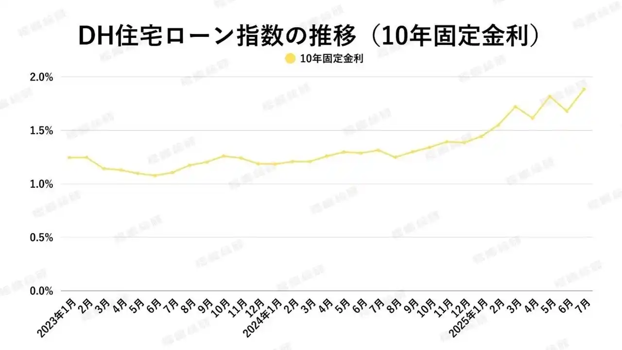 10年固定金利は「10年国債」の利回りを参考に決まります。 7月は、参院選後の財政拡大懸念や日米関税交渉の決着などから国債金利が上昇し、10年国債の利回りは1.462% → 1.559%へ上がりました。 その結果、DH住宅ローン指数の10年固定は1.885%と前月(1.680%)から大幅上昇しました。前年(1.315%)と比べると、すでに0.5%以上も高くなっています。 |