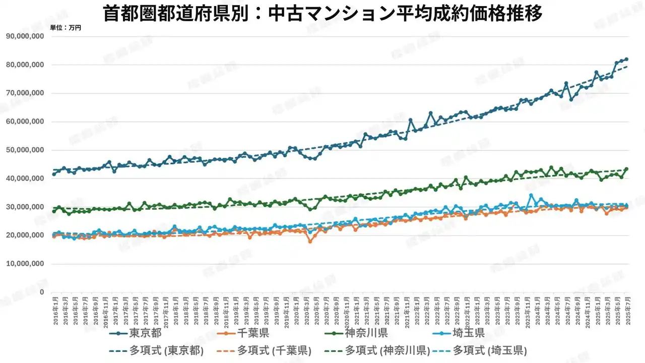 | 一方、首都圏の住宅市場の動向にも変化が見られます。東京都を除く埼玉県、千葉県、神奈川県の平均購入価格は、2024年前半までは上昇傾向にありましたが、その後の推移は地域ごとに差が生じています。具体的には、埼玉県と千葉県では平均購入価格が微減傾向となり、神奈川県ではほぼ横ばいで推移しています。 | ||||||||||||||