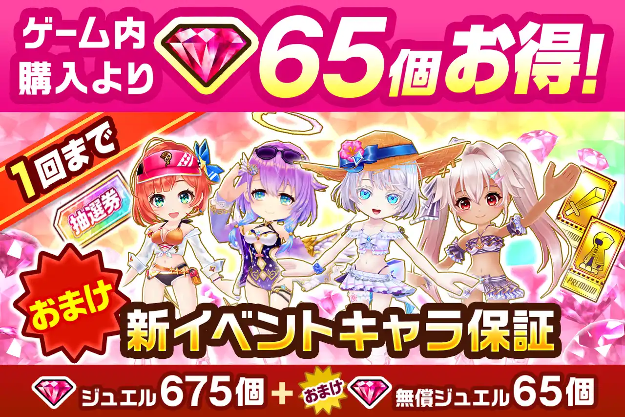 内容物:「ジュエル」675個、「無償ジュエル」65個、「新イベントキャラ保証」など |