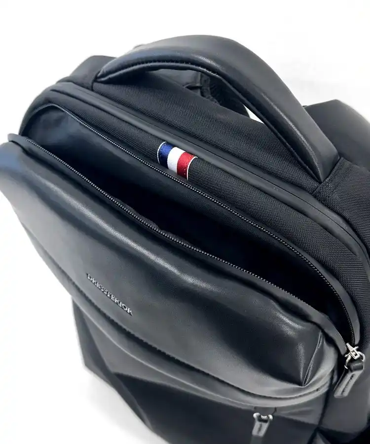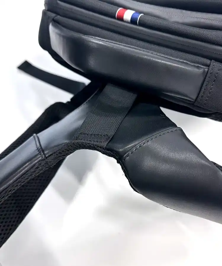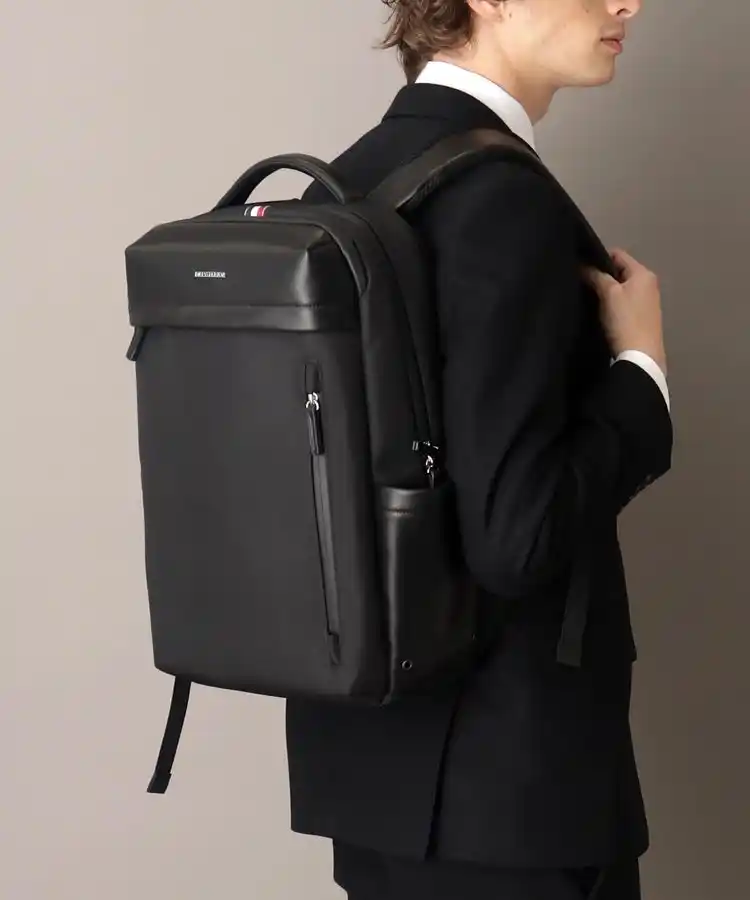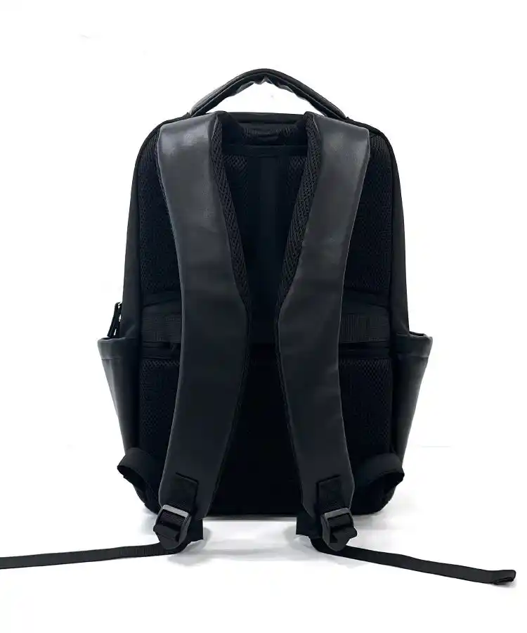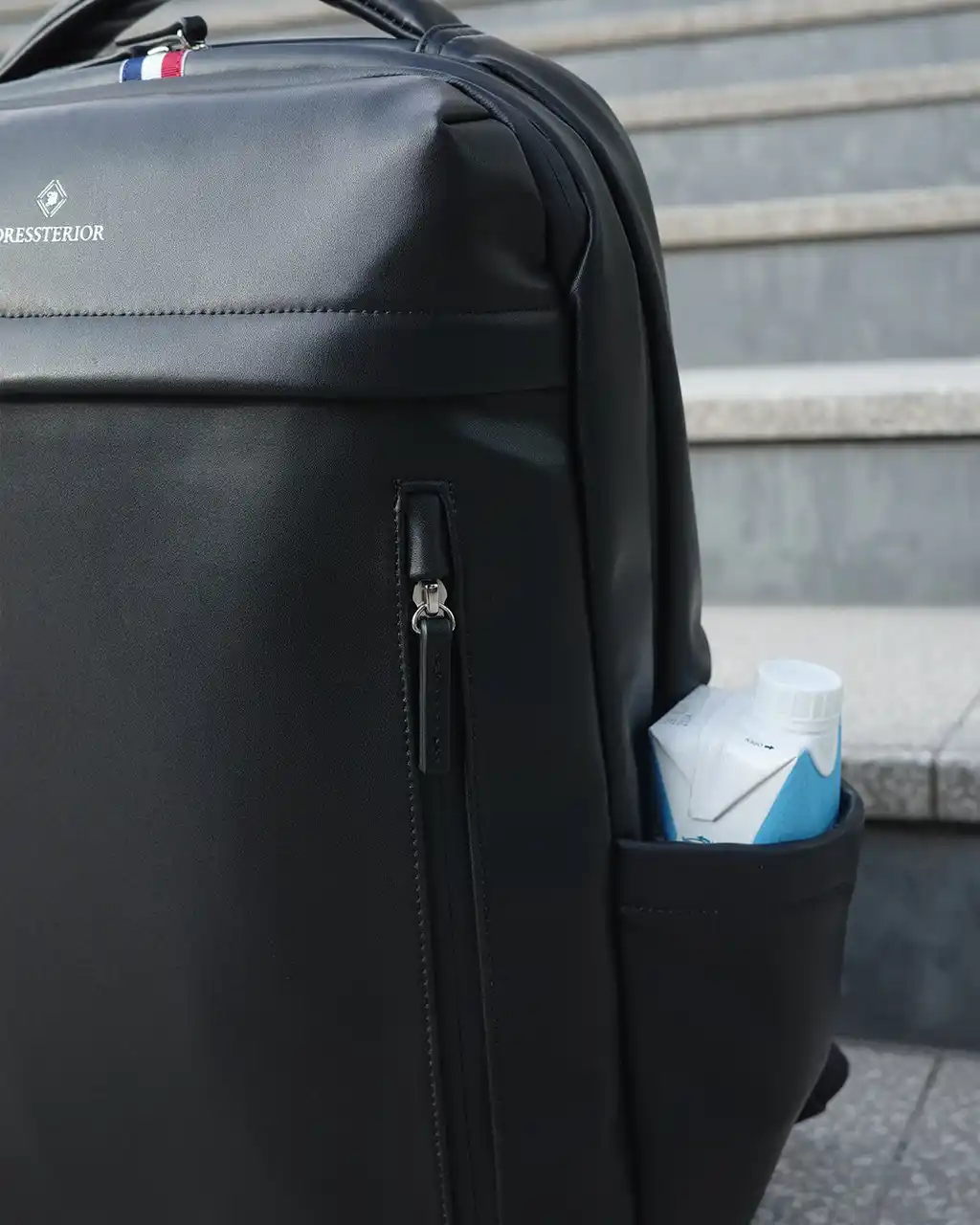 メインルームにはノートPC収納用のポケットが1つ、仕分けに便利な小さいポケットを3つ搭載しています。トップと前面にも収納スペースが豊富になり、傘やペットボトルが入るサイドポケットもあります。背中に貴重品を収納することができるセキュリティポケット、キャリーケース固定ベルトを搭載した、ビジネス用にも大変おすすめなバッグです。 各所に使用されているリサイクルレザーは、雨の日にも強い撥水加工を施しており、見た目も肌触りも非常に滑らかな一品となっています。 |