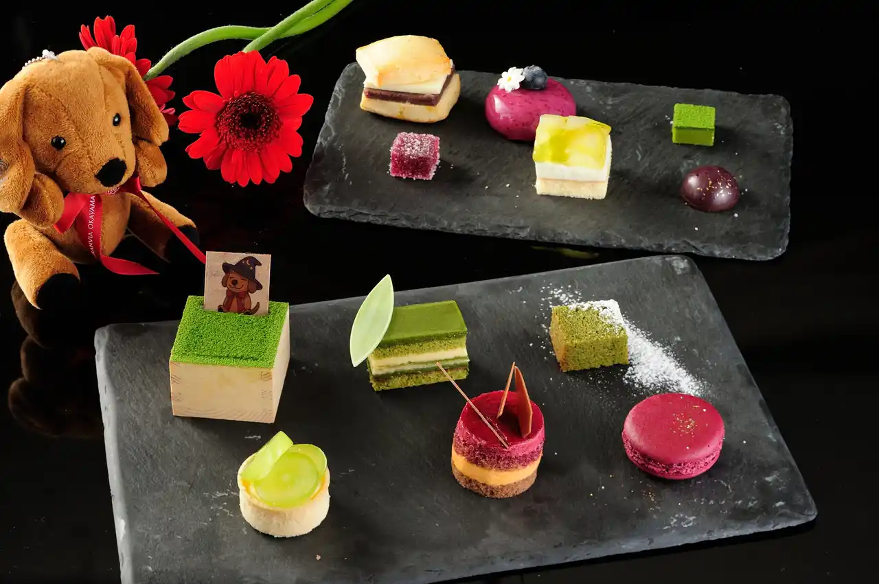 今回のテーマカラーは「紫×緑」。葡萄や紫芋、抹茶をはじめ、寿永3年の創業より愛されている岡山の銘菓「藤戸まんぢゅう」のあんこを使用したスイーツとセイボリーが彩り豊かに並びます。みずみずしい葡萄が層をなすパフェや、ホテルグランヴィア岡山のマスコット「晴太 -HARETA-」がペイントされたチョコレートを添えたガトーショコラも登場し、大人可愛い仕上がりに。秋の味覚を取り揃えたアフタヌーンティーで優雅な午後のひとときを。 |