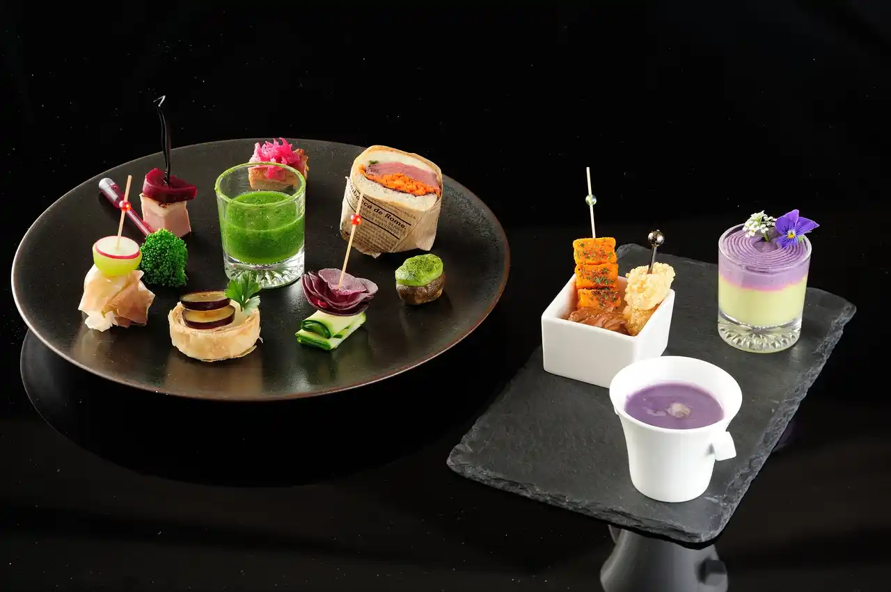 秋の味覚を活かしたセイボリーは、見た目の彩りだけでなく味のバランスも抜群です。紫芋のスープに添えた藤戸まんぢゅうのフリットは、口に入れると中の餡がほろほろとほどけ、優しい甘みが広がります。伝統の味わいを新しい食感でお楽しみいただける一品です。さらに、「ピオーネとチーズのタルト」や「マスカットと生ハムのボール」など、秋の味覚と色彩を意識したセイボリーが並び、食べ進めるたびに楽しみが広がります。 |